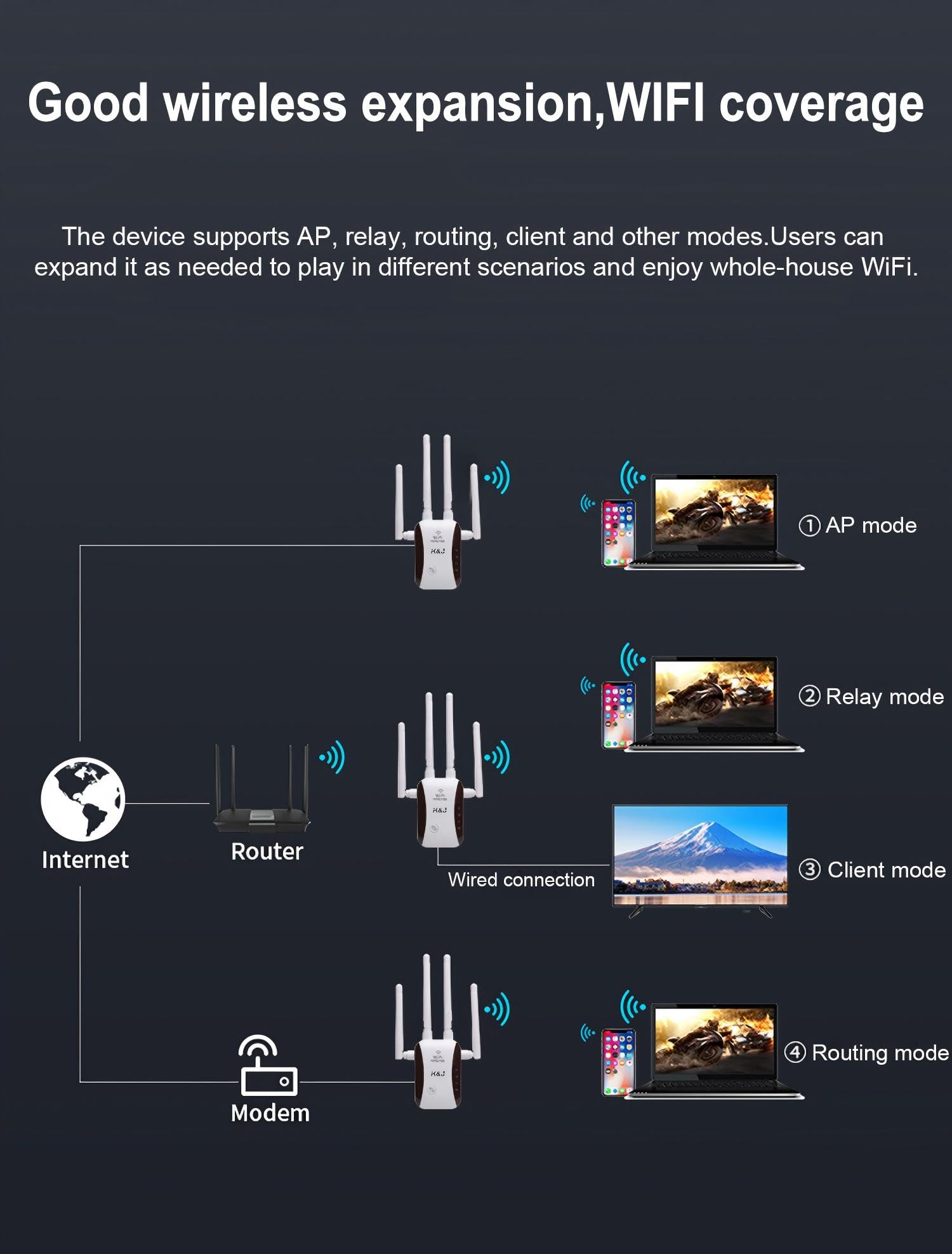 - Multiple Mode Support:This WiFi Booster device supports multiple modes such as AP, relay, routing, client, etc. The setup is simple. Users can follow the quick installation guide to select the desired mode for expansion, play in different scenarios, and enjoy whole-house WiFi