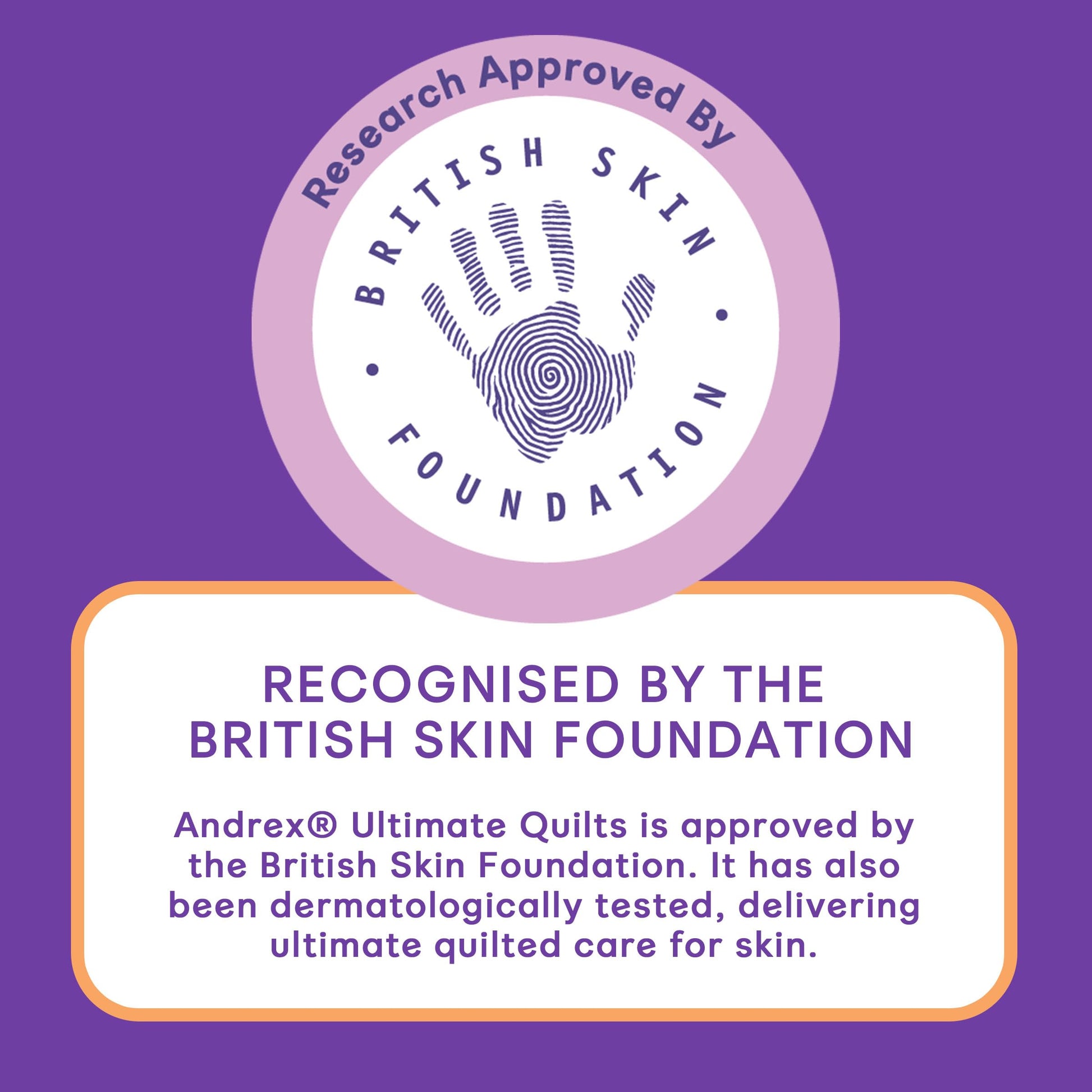 Ultimate Quilts is our softest and most comforting for skin. Dermatologically tested, our thick, super soft sheets have a unique Air Pocket texture. Approved by the British Skin Foundation. To feel even fresher, pair with Andrex Hygiene Wipes. This packaging is made from 50 Percent recycled plastic. Learn more at www.andrex.co.uk/sustainability. To find out more about our work with Bowel Cancer UK, visit www.andrex.co.uk/bowelcanceruk. Kimberly-Clark Europe Ltd, Walton Oaks, Dorking Road, Tadworth, Surrey, KT20 7NS, UK. www.andrex.co.uk. Kimberly-Clark B.V., Copernicuslaan 35, 6716 BM Ede, Netherlands. www.kimberly-clark.com. Warning: To avoid risk of suffocation, please keep plastic bags away from children.