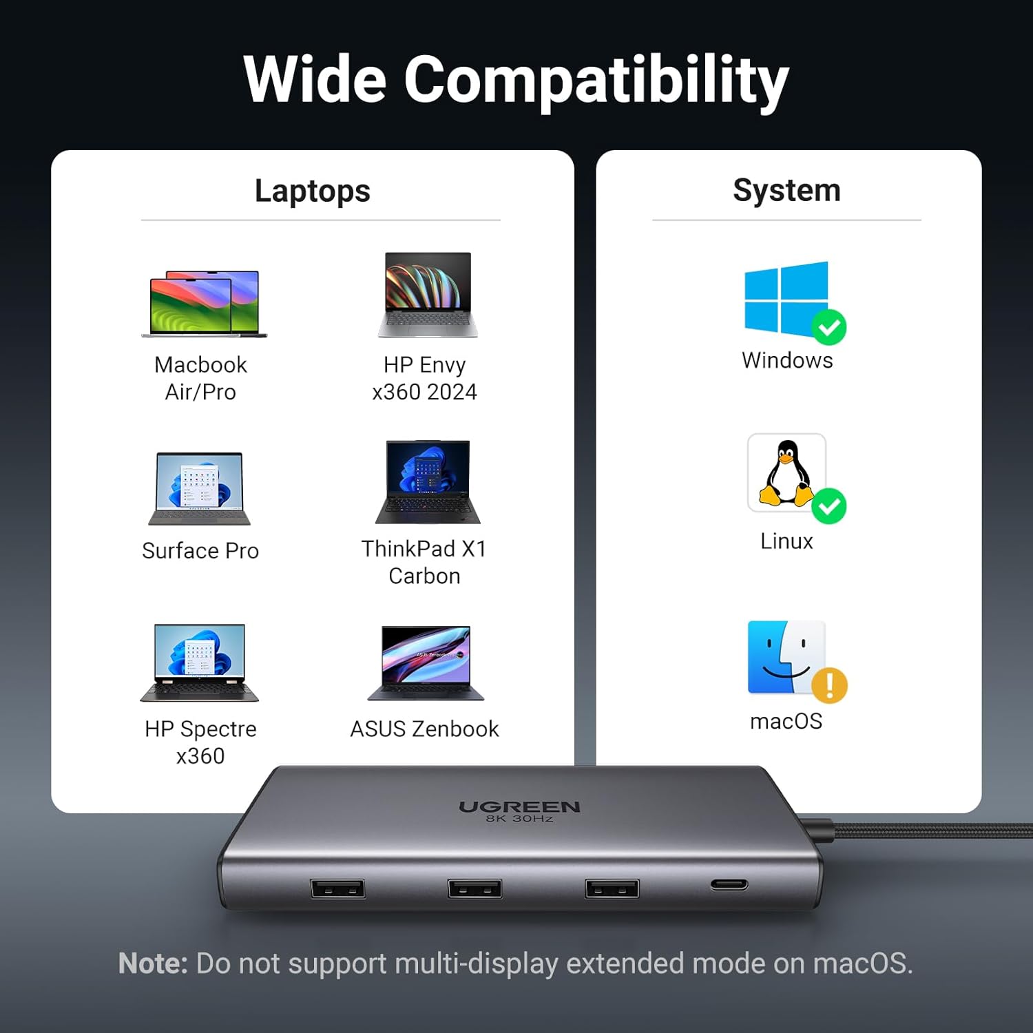 | 1 | The dock works with Windows 11/10, macOS, Linux, iOS, Android Devices. Support only single display when connected to a tablet or mobile phone. |