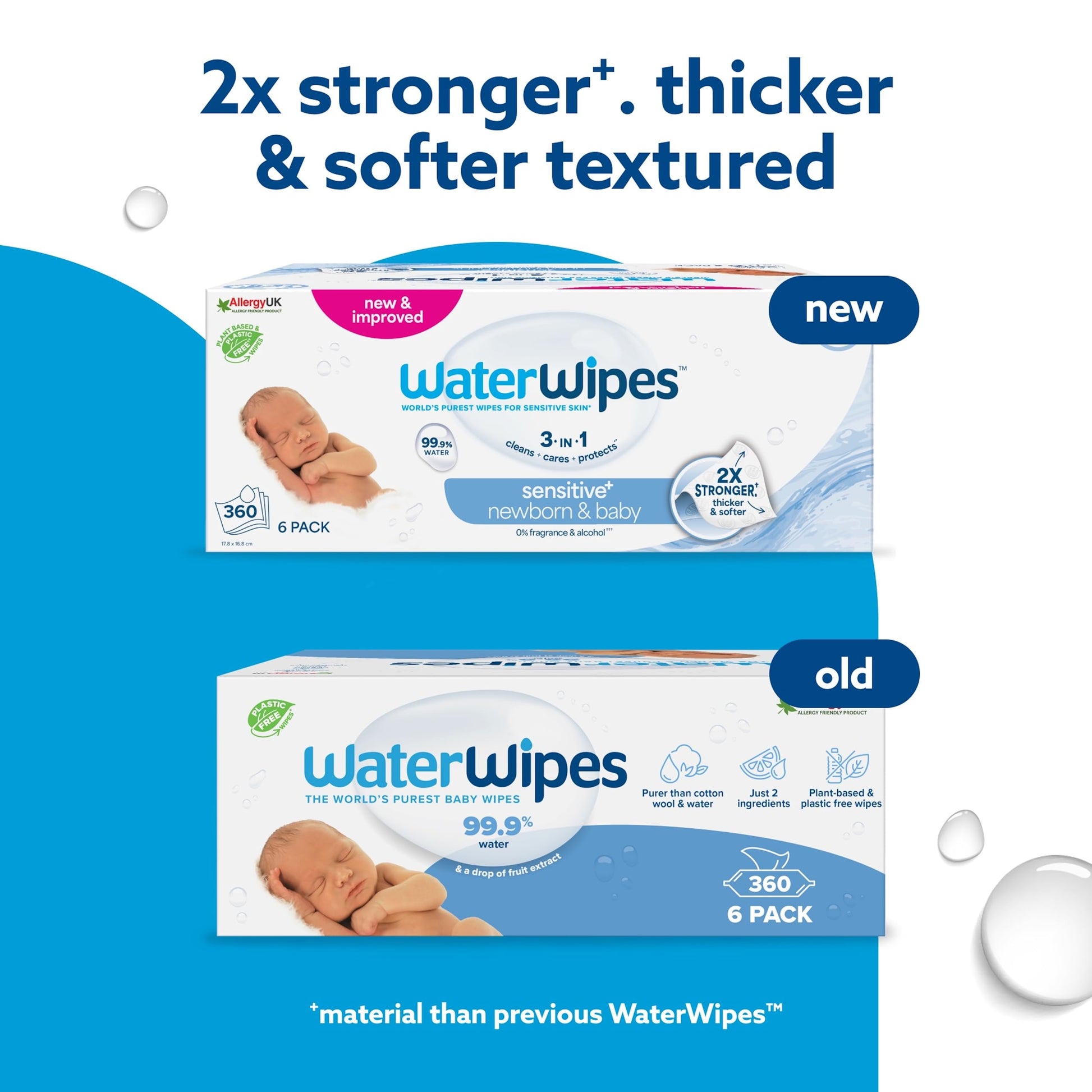 Introducing New & Improved WaterWipes, the World’s Purest Wipes for Sensitive Skin. Families can continue to trust WaterWipes Sensitive+ New Born & Baby Wipes to gently clean, care and help protect sensitive skin - now with a 2X stronger†. Thicker and softer wipe, and a fresh new look. Our plant-based & plastic free†† wipes maintain the same purity, with just two carefully selected ingredients: 99.9% ultra-purified water and a drop of fruit extract. Our ultra-purified water undergoes a 7-step process, making it even purer than tap, boiled, or bottled water. WaterWipes remain unscented and gentle on sensitive skin. They are clinically proven to be kind to babies’ skin—giving parents the confidence to help protect their children in the purest way possible. WaterWipes was born from a father's love—our founder created these wipes after his newborn suffered from nappy rash realising that skin this pure deserves care that’s just as pure. That inspiration led to the creation of the world’s purest wipes for sensitive skin, trusted by families worldwide for everything from nappy changes to messy hands and faces. †material than previous WaterWipes™ ††Claim does not refer to the full product lifecycle nor packaging. Wipes made from regenerated cellulose.